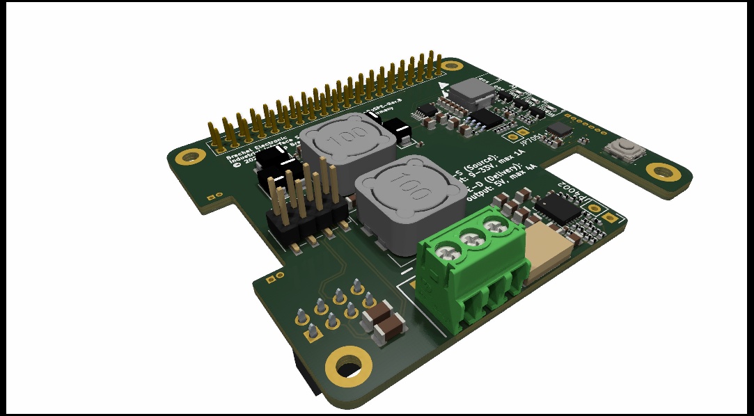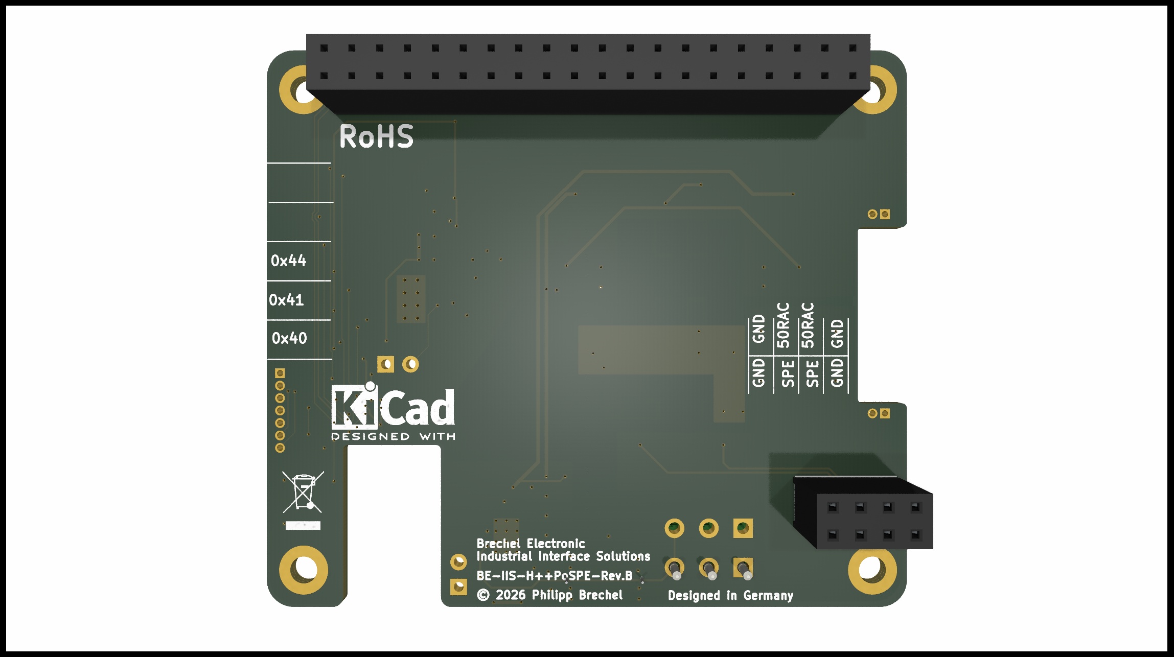 This HAT enables PoSPE for BE-IIS-T1S and BE-IIS-T1L HATs, providing up to 1~A at 9–33~V over Single Pair Ethernet. On the sourcing side, the board integrates a DC/DC conversion stage generating a regulated 5~V supply with up to 4~A output for system-level power distribution.
