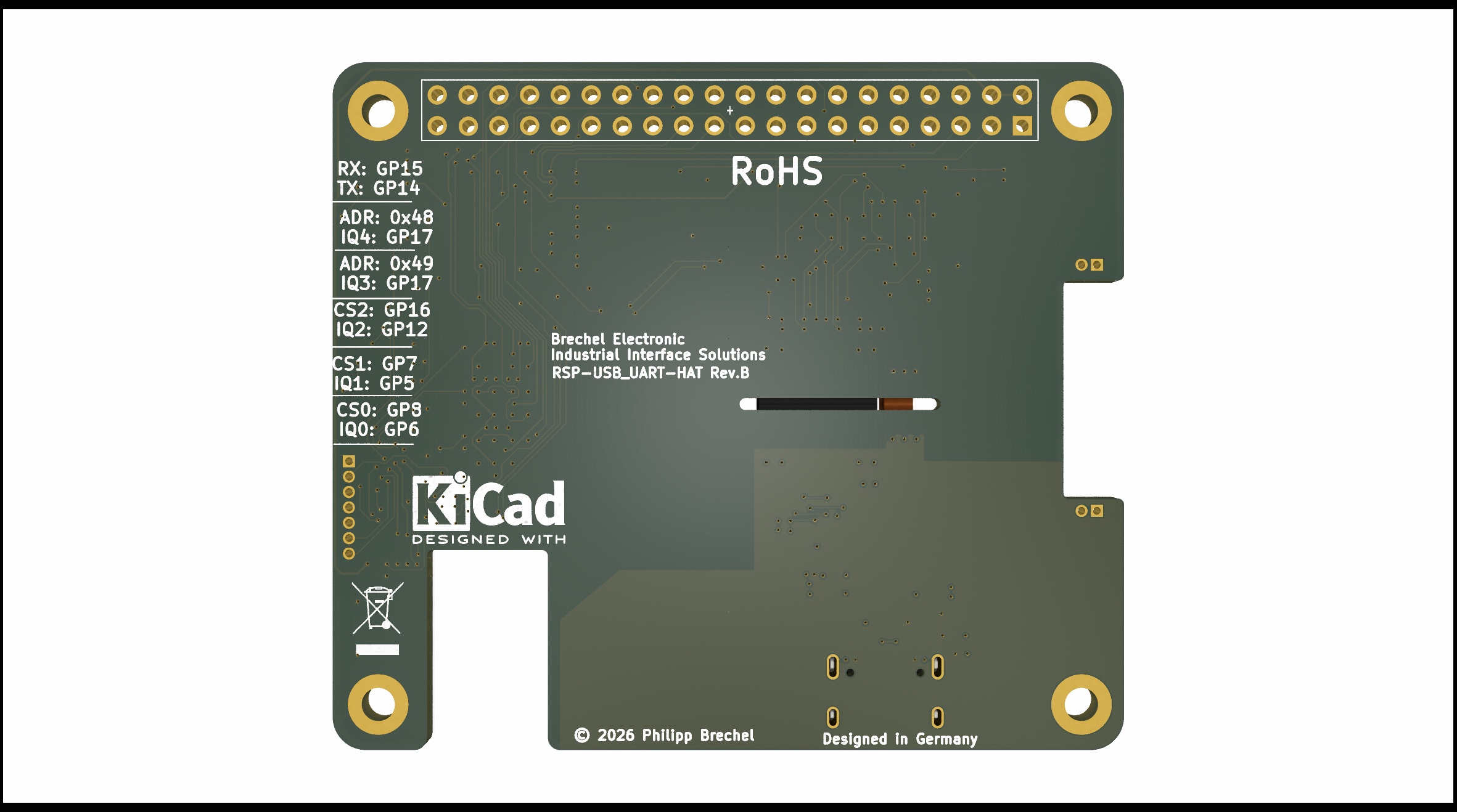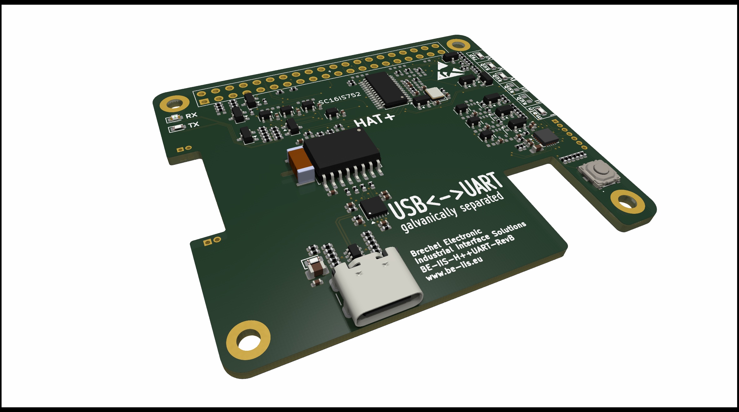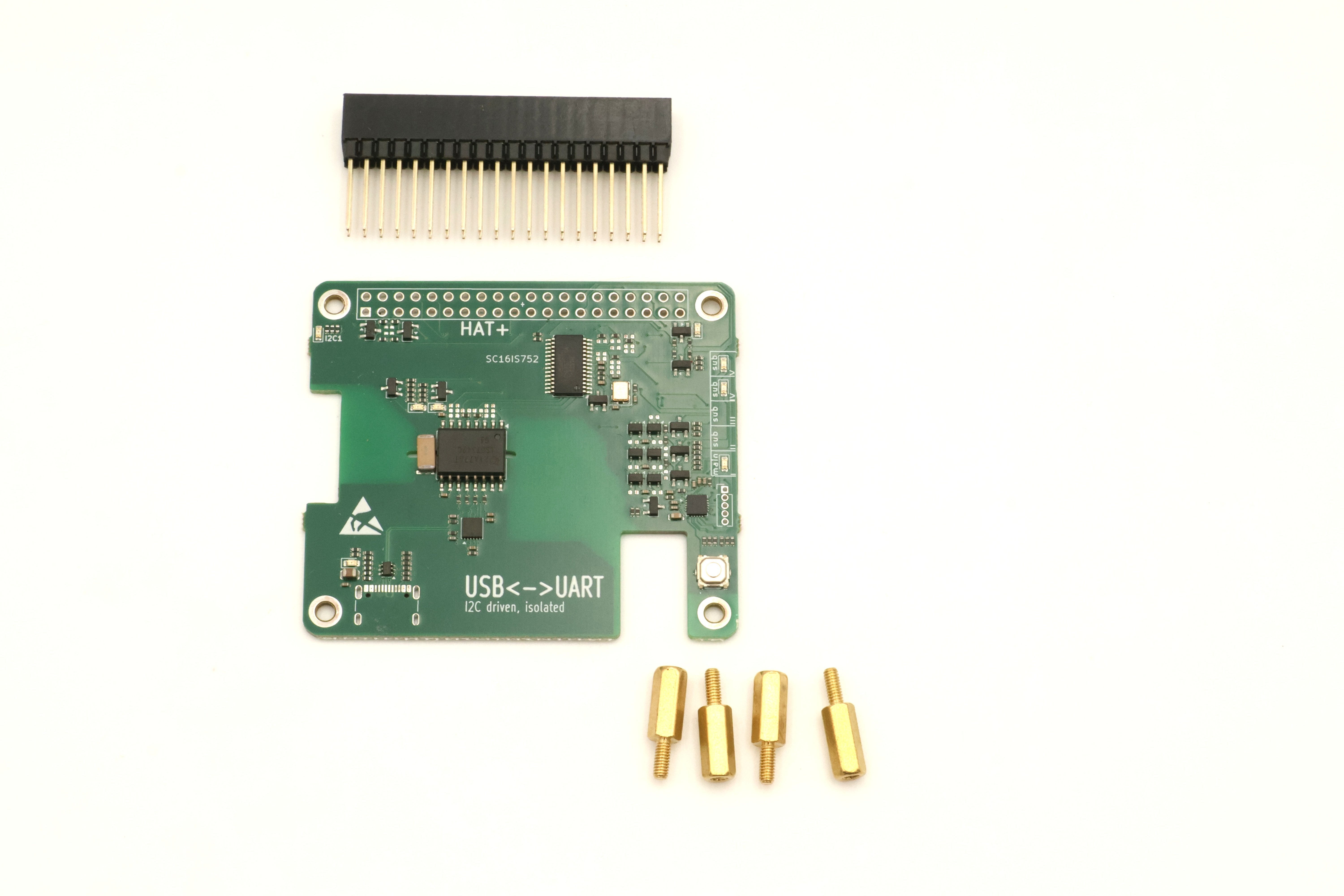 This HAT provides a UART-to-USB connection. Galvanic seperation between the UART and USB sections ensures electrical robustness and protects the system against ground potential differences and noise coupling.